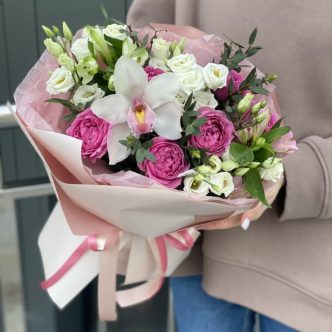 Стоимость букета зависит от количества роз, которое регулируется в меню конструктора с помощью "+/-". При этом, чем больше вы роз заказываете, тем дешевле цена одной розы в букете.