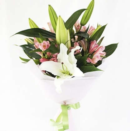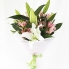 Красочный букет состоящий из лилии и альстромерии , в красивой и стильной упаковке