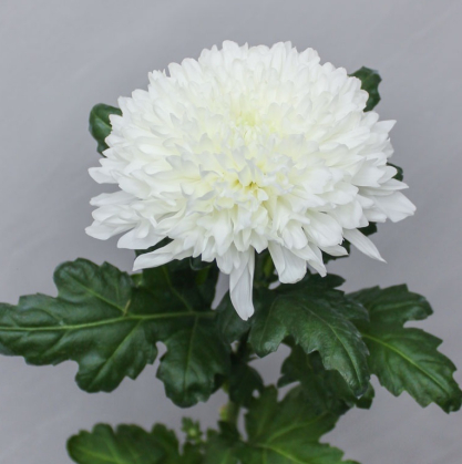 Белоснежный сорт одиночных хризантем, соцветие полушаровидное. Кусты прочные, с темно-зелеными хрустящими листьями, высотой 0,9 м. Имеет высокий стебель высотой примерно 70-80 см, на котором расположен махровый цветочный купол белого цвета. Диаметр полностью раскрытого цветка составляет около 15 см. Данные цветы отличаются стойкостью и шикарным видом.