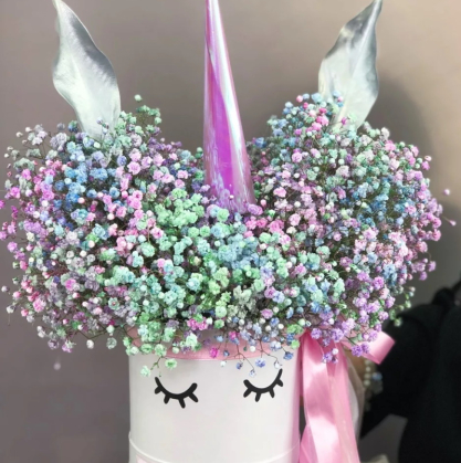 Композиция из цветной гипсофилы в виде игрушки.
