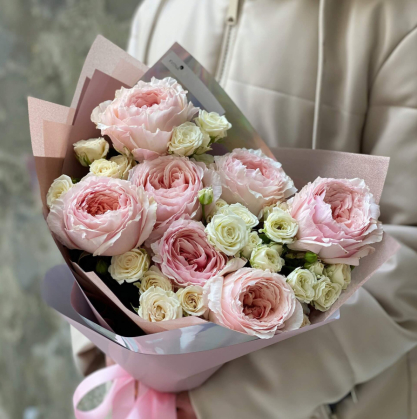 Очень нежный, чувственные букет подойдет для любимого человека. В состав входят пионовидные розы сорта O'Hara и голландские кустовые розы. Букет упакован в дизайнерскую обертку.