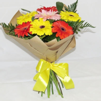 Букет из гербер и папоротника в крафт бумаге