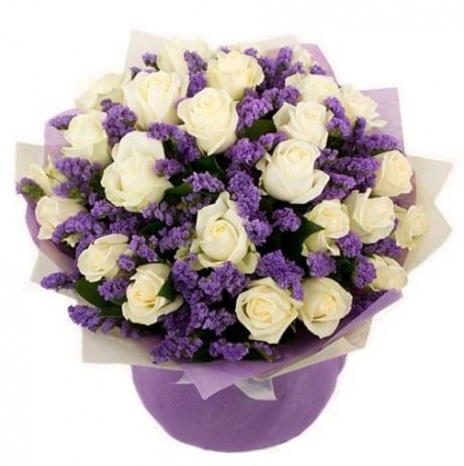 Удивительный букет из Эквадорских белых роз и сиреневой статицы. Очень красивое сочетание.